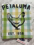 grey and white checkered tea towel with Petaluma and a chicken on it